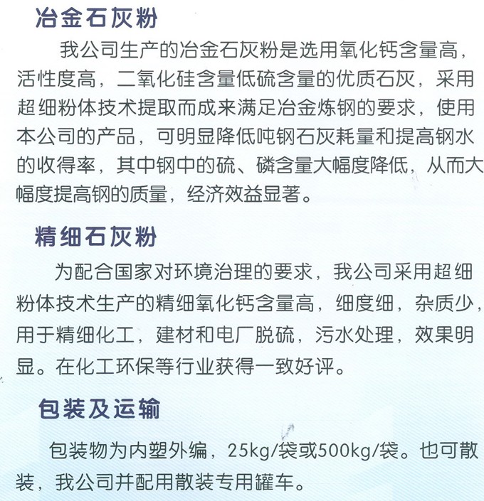 生產的氫氧化鈣、氧化鈣、重質碳酸鈣、灰鈣粉,主要用于電力行業脫硫、污水處理、冶金、皮革、涂料、造紙化工等行業